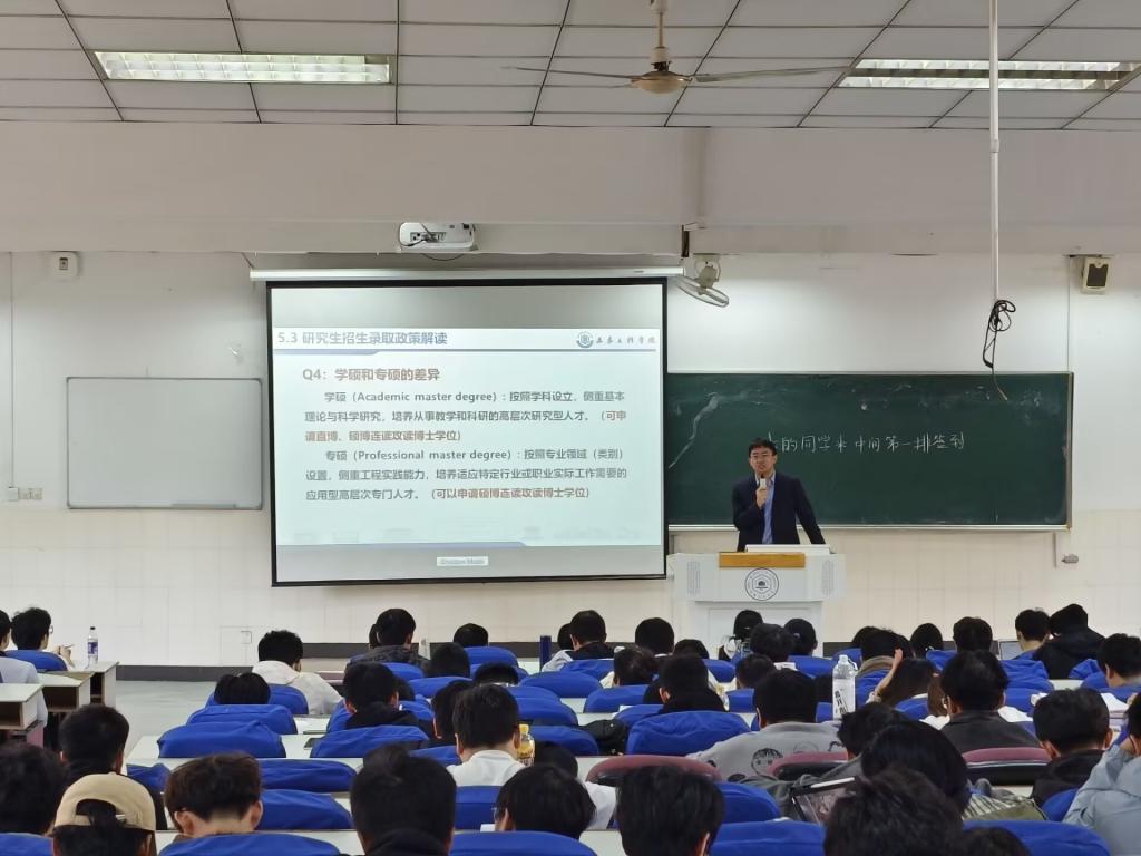 辅导员张腾飞首先做动员讲话,他强调考研深造对于同学们提升个人专业竞争力、拓宽未来职业发展空间的重要意义,鼓励同学们要立足当下,树立远大目标,脚踏实地,积极行动起来,并表示年级将全力为同学们的考研之路提供支持与服务。随后,西安建筑科技大学李安邦副教授为同学们带来了一场内容丰富、指导性强的考研政策讲座。讲座中,李教授结合当前建筑行业发展趋势与人才需求,深刻剖析了攻读硕士学位对于个人成长发展的重要价值,并从招生政策、院校专业选择、备考策略等进行深入浅出地讲解。在互动环节,同学们踊跃提问,就自己关心的择校择专业等问题与李教授进行了深入交流,现场气氛活跃。