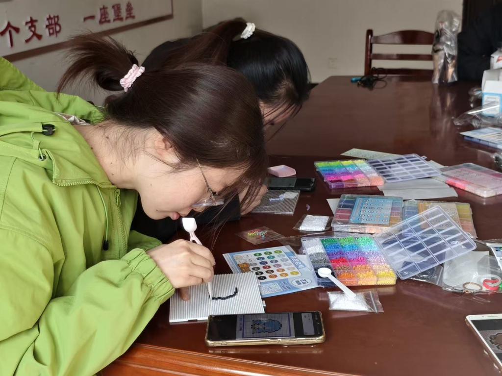 过程中,同学们细心配色、精心摆放,不时交流技巧、互相协助,现场气氛轻松而热烈。经过拼摆、熨烫等步骤,零散的彩豆渐渐变成一件件独具特色的挂件、杯垫等作品。手捧自己完成的作品,同学们脸上洋溢着满足的笑容,感受到动手创作带来的愉悦与成就感。