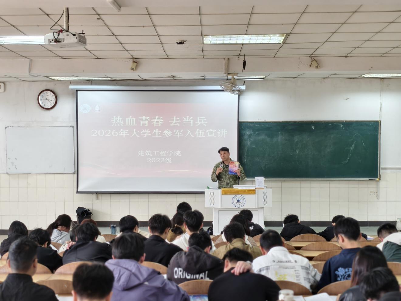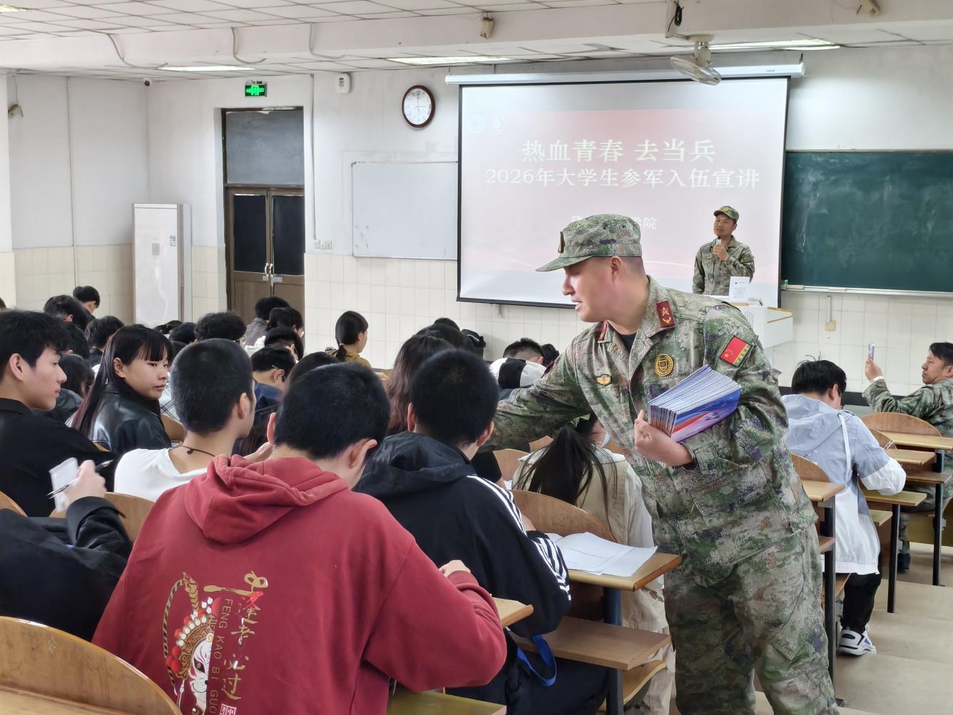 为扎实推进2026届毕业生征兵工作,4月24日下午,伟德国际1946在秀山校区阶教101教室举办征兵政策宣讲会。活动特邀花山区人武部军事科参谋夏强、校征兵工作站老师嵇虎担任主讲,学院党委副书记、纪委书记、副院长王颖之、毕业班辅导员及全体毕业班学生参加。