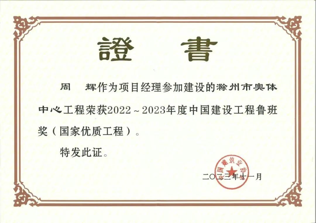 2022~2023年度中国建设工程鲁班奖入选名单于2023年11月正式公布。滁州市奥体中心作为滁州市重点民生工程和城市新地标,设计优美,技术复杂。在项目建设过程中,周辉校友作为项目经理,带领团队攻坚克难,将专业知识与工匠精神倾注于每一处细节,为工程最终问鼎行业最高奖项作出了重要贡献。